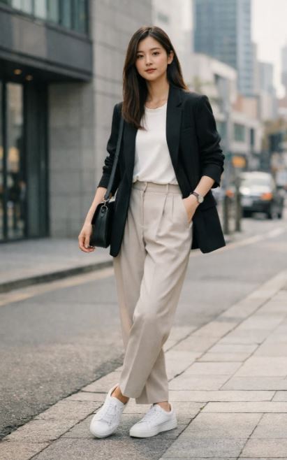 | Style formel | Pantalon taille haute + blazer | Derbies brillants, sac structuré |